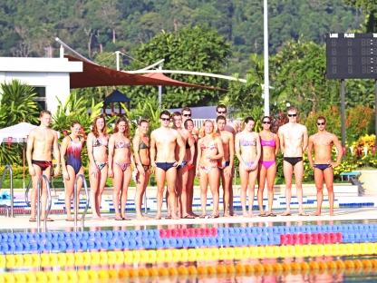 Nella foto la Nazionale olandese posa sul bordo vasca della piscina olimpica di Thanyapura (la terza da destra è Ranomi Kromowidjojo).