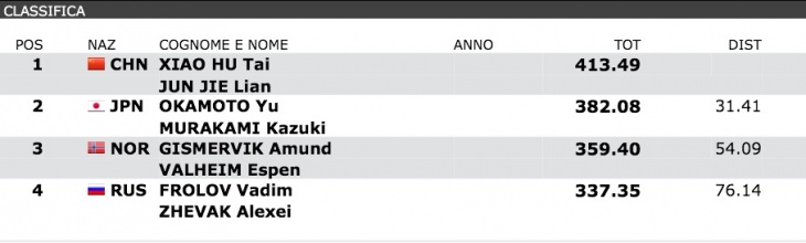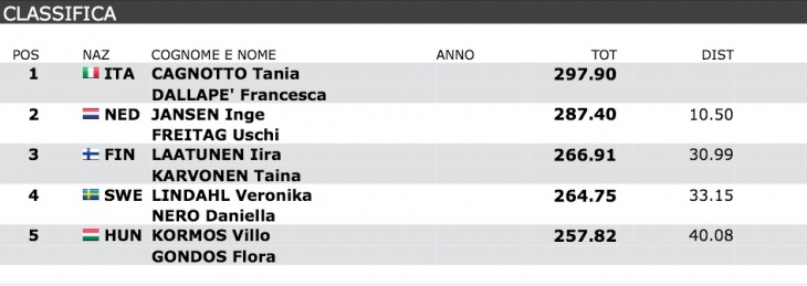 La prima giornata di gare del GP di Bolzano e' iniziata bene: dei 4 trampolinisti impegnati nell'eliminatoria dal trampolino di 3 metri due, come da regolamento FINA, sono passati in finale: Tommaso Rinaldi, che ha chiuso 5° con 400.40 e Michele Benedetti 6° con 396.70. Eliminato, anche se era dentro i 12 atleti classificati, Andrea Chiarabini 9° con 373.80, mentre Giovanni Tocci ha concluso in 17° posizione con 346.20 punti. Bene anche la new entry dalla piattaforma: Giulia Belsasso alla sua prima gara internazionale assoluta ha passato il turno con la 9° posizione e 243.55 punti. Nel primo pomeriggio si sono svolte le semifinali: come sempre gli atleti "dispari" si sono sfidati nella semifinale "A" mentre I "pari" in quella "B". Per Benedetti ennesima qualifica: per lui 413.05 punti e la terza posizione dietro ai giapponesi Terauchi e Sakai: cio' vuol dire che lo rivedremo in finale sabato pomeriggio; meno bene la prestazione di Rinaldi: galeotto fu il triplo e mezzo ritornato che gli ha fruttato solo 56 punti... Peccato perche' ai recenti Assoluti e' stato uno dei suoi migliori; Tommaso ha chiuso 5° con 388.80 punti. E purtroppo in semifinale si è fermata anche la Belsasso, che attualmente non avrebbe comunque potuto rivaleggiare con le prime tre tuffatrici qualificate, le cinesi Yu Jie Xia, Bing Qing Xia e la giapponese Minami Itahashi, ma ha anche comesso un errore nel doppio e mezzo rovesciato. Per lei la sesta posizione e 235.70 punti. E alle 18 abbiamo assistito alle prime finali di questo Gran Premio di tuffi, con Francesco Dell'Uomo e Maicol Verzotto purtroppi assenti nei tuffi sincronizzati da 10 metri: Maicol infatti ancora "paga" per la botta presa al polso destro alla Coppa del Mondo e ha preferito stare a riposo per arrivare nelle condizioni migliori agli Europei. A chiudere questa prima giornata Tania Cagnotto con Francesca Dallape' in sicro dal trampolino di 3 metri: una finale senza particolari avversarie e dove le nostre azzurre hanno vinto con una prestazione buona, ma non eccezionale; dopo le molte gare internazionali e qualche acciacco la coppia ha ripreso da poco ad allenarsi a pieno regime: é normale quindi aver assistito oggi a tuffi ancora poco precisi, ma che comunque sono stati piú che sufficienti per portare a casa la prima medaglia d'oro.