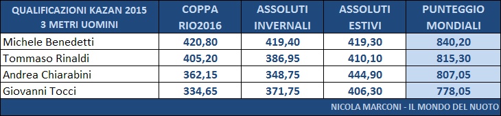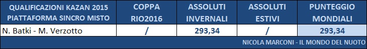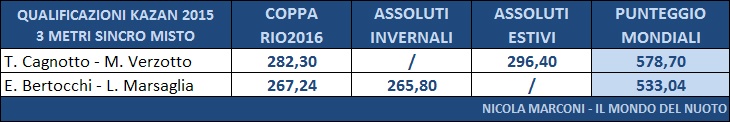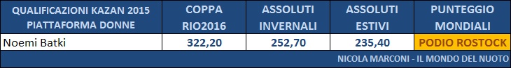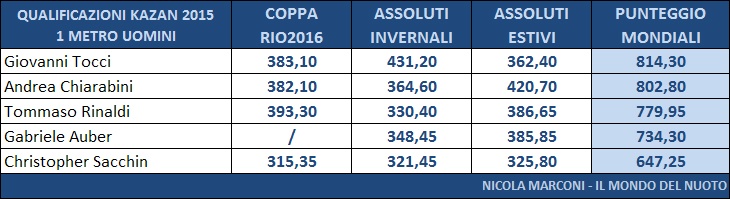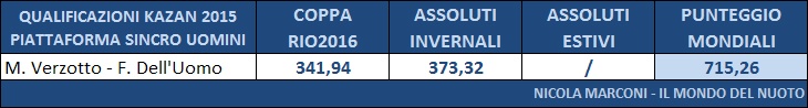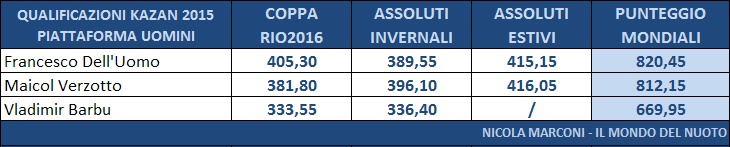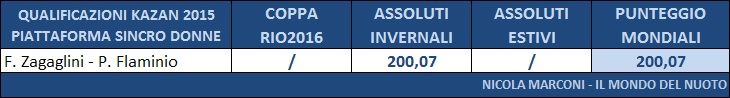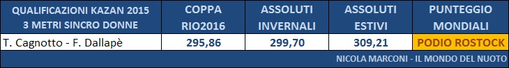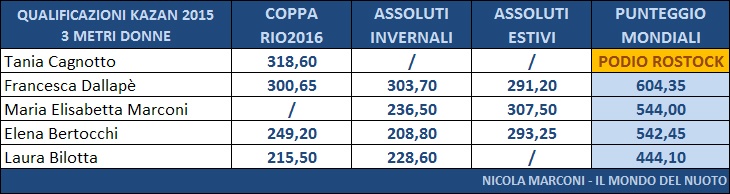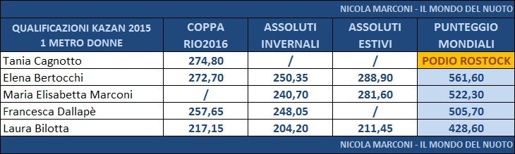Nonostante la vittoria agli Assoluti Estivi da parte di Maria Marconi, Francesca Dallapé ha ottenuto una somma di punteggi piú alta ed ha ottenuto la convocazione e gareggerá a Kazan insieme alla sua compagna di sincro Tania Cagnotto, giá qualificata di diritto.