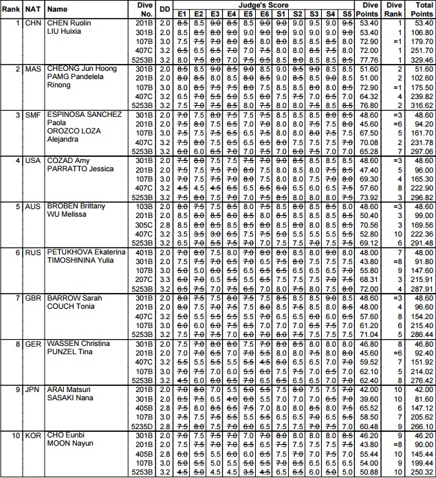 Nell’altra eliminatoria di giornata, il sincro dalla piattaforma femminile, si è deciso soltanto l’ordine di classifica, in quanto le coppie iscritte erano soltanto dieci. Davanti a tutte le immancabili cinesi, mentre alle loro spalle si sono distinte le malesi Pamg e Cheong, scuola in forte ascesa negli ultimi anni, che si prenotano per una storica qualificazione olimpica anche in questa specialità. In difficoltà le russe Petukhova e Timoshinina, campionesse europee, e le britanniche Couch e Barrow.