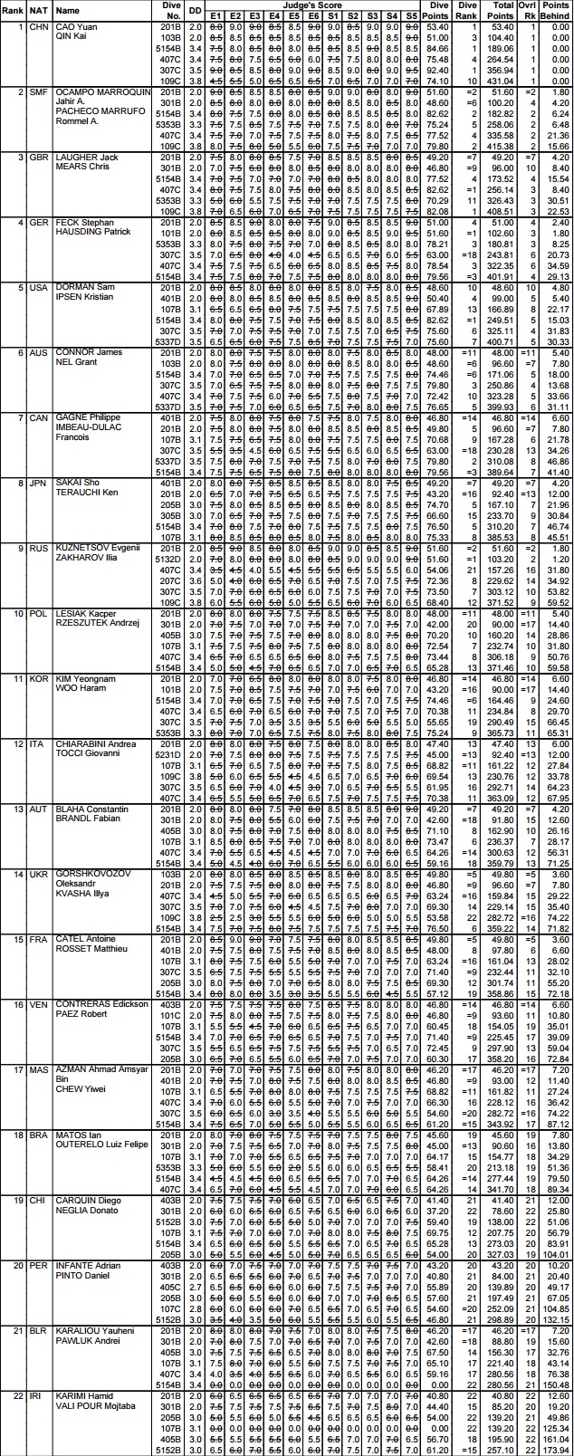 Neanche il triplo e mezzo ritornato, solitamente il loro cavallo di battaglia, ha fruttato più di 70 punti. È stato comunque il loro miglior tuffo, grazie a una buona sincronia, ed è bastato a superare sul filo di lana le tre coppie che si ritrovavano nelle posizioni appena sopra l’Italia al penultimo tuffo: troppo bassi, infatti, i punteggi di Austria, Francia e Venezuela all’ultima rotazione per restare al di sopra della nostra coppia. Clamorosa l’eliminazione dell’Ucraina, coppia data per favorita: esito disastroso sul quadruplo e mezzo avanti e comunque mai tra le migliori dodici per tutta la durata dei tuffi liberi.