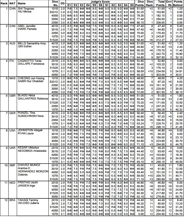 Alle loro spalle si consolidava un terzetto formato da Gran Bretagna, Australia e Canada, con le sole Blagg e Gallantree ancora alla caccia di un pass olimpico. Per Tania e Francesca però è stato facile aumentare il distacco con un avvitamento da 72.90 punti, che le ha lasciate vicine alle cinesi.