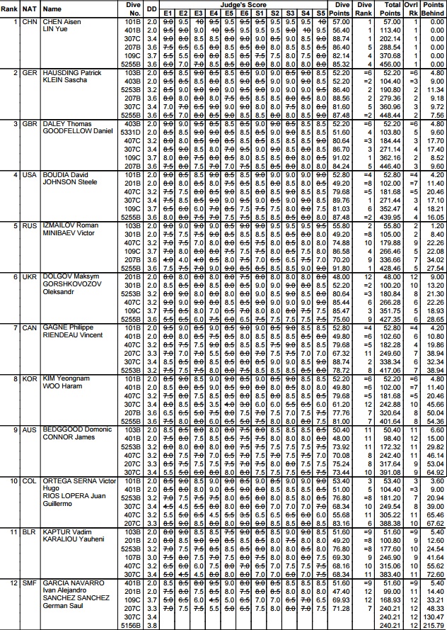Anche questa una finale funestata dal maltempo, che è stata interrotta per 40 minuti, ma che è comunque stata "tiratissima": le prime 4 coppie infatti sono state protagoniste di ottimi tuffi ed il risultato finale è sempre stato sul filo. America - con David Boudia e Steele Johnson - Inghilterra - con Toma Daley e Daniel Goodfellow - Germania - con Patrick Hausding e Sasha Klein - e poi Cina - con Aisen Chen e Yue Lin - hanno combattuto fino all'ultimo per un posto sul podio e sopratutto un biglietto per Rio ad agosto.