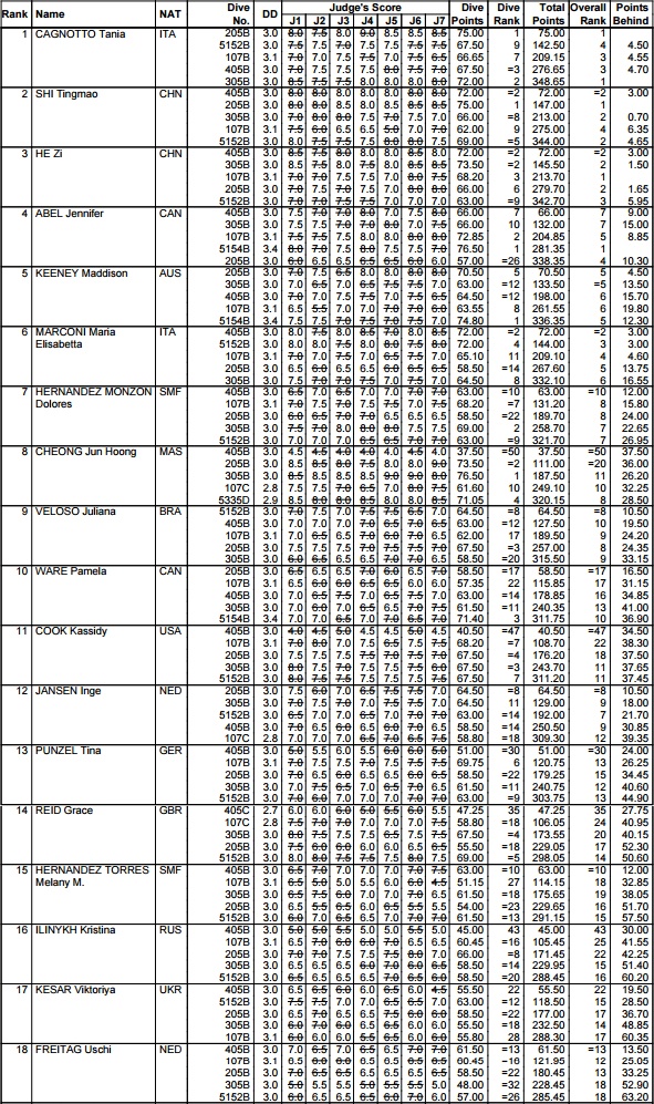Nel gruppetto di testa, oltre alle due italiane e alle immancabili cinesi, l'elegante He Zi e la potente Shi Tingmao, si sono ritrovate anche due delle solite avversarie per il podio: la canadese Jennifer Abel, che ha eseguito un doppio e mezzo con due avvitamenti "da urlo" (76.50!), e l'australiana Maddison Keeney, che ha finalmente trovato stabilità e regolarità e che, possedendo a sua volta nel proprio arsenale il doppio-con-doppio (anche per lei punteggi altissimi, 74.80), diventa una temibile rivale in vista delle Olimpiadi.