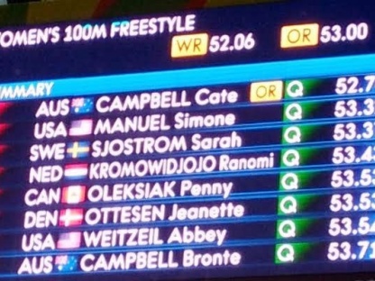 Rinunciataria Federica Pellegrini che dice di averlo fatto in funzione della successiva staffetta 4x200 stile libero, che poi si rivelerà senza gloria.