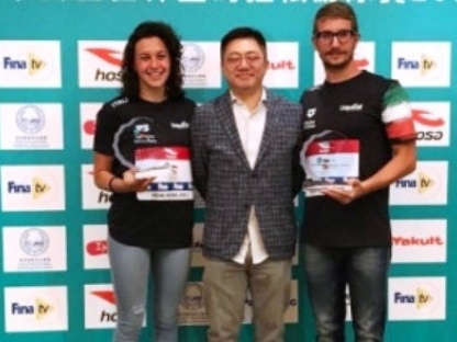 Il duo italiano Arianna Bridi e Simone Ruffini ha vinto la Coppa del Mondo FINA di nuoto maratona 10km pur con performance contrastanti nella tappa finale – la settima – disputatasi ieri nella Baia di Hong Kong (Repulse Bay) – del circuito (in copertina durante la premiazione a Hong Kong).