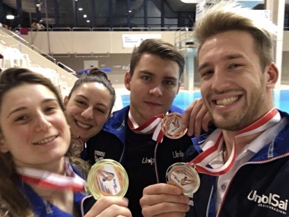 Già questa mattina li avevamo visti molto determinati nella fase eliminatoria: dal trampolino di 1 metro Auber aveva in terza posizione (332.15 punti) e Cristofori in quarta (310.00 punti); dal trampolino di 3 metri Bertocchi si era piazzata in prima posizione (2286.95 punti) con la Bilotta quarta (260.50 punti). E se in eliminatoria avevano commesso qualche errore, per Gabriele doppio e mezzo indietro e doppio e mezzo ritornato, per Ruslan il doppio e mezzo avanti ed il doppio e mezzo indietro, per la Bertocchi il triplo e mezzo avanti carpiato e per la Bilotta il doppio e mezzo rovesciato carpiato, oggi pomeriggio sono stati in grado di mantenere alto il livello dei loro tuffi.