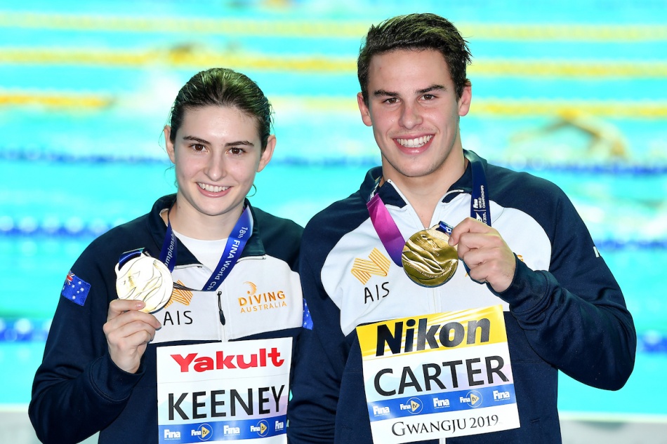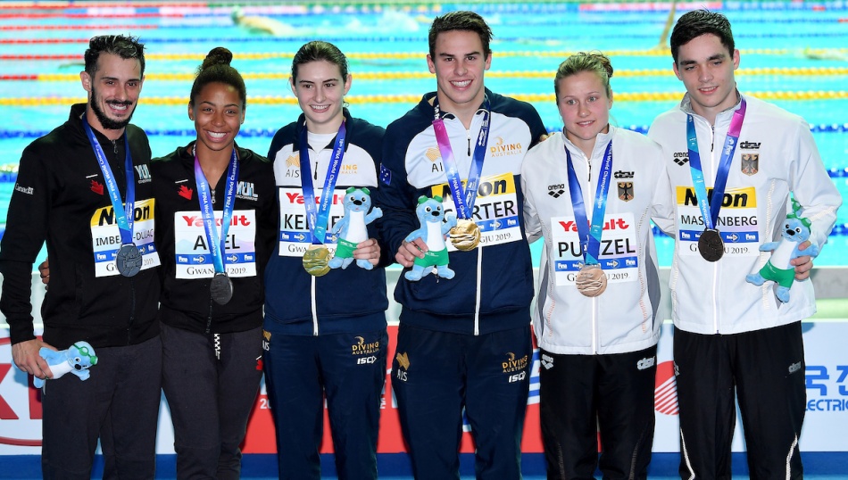 I nuovi campioni del mondo sono gli australiani Maddison Keeny e Matthew Carter (sopra e al centro del podio sotto) con 304.86, davanti ai canadesi Francois Imbaeau-Dulac e Jennifer Abel, che salgono un gradino del podio rispetto a due anni fa, con 304.08 punti, e ai tedeschi Lou Massenberg e Tina Punzel, con 301.62. Quarti i britannici Thomas Daley e Grace Reid, con 298.47 punti (furono settimi a Budapest 2017 e settimi agli Europei di Edimburgo 2018).