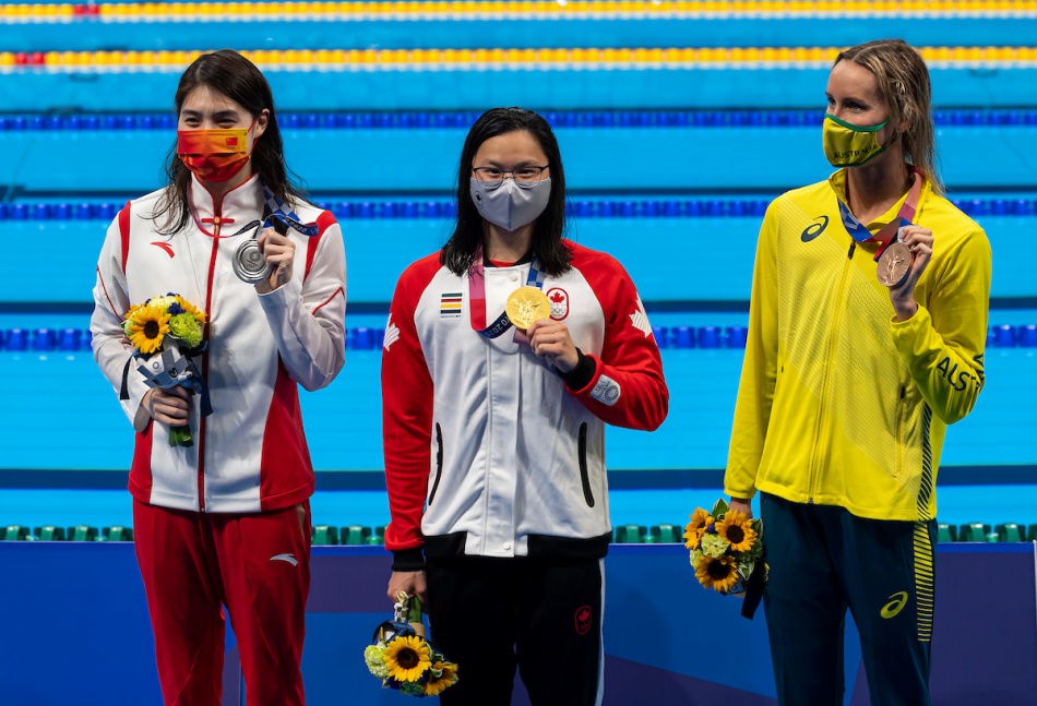 Nei 100 farfalla donne la canadese Margaret Macnel (sotto sul podio) a sorpresa vince l'oro in 55.59 davanti alla cinese Yufei Zhang 55.64 e all'australiana Emma McKean 55.72.