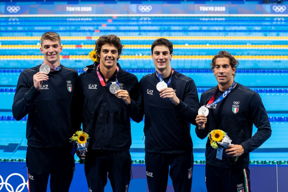 La staffetta 4x100 stile libero per la prima volta sale sul podio olimpico, conquistando la seconda medaglia dopo il bronzo della 4x200 stile libero di Massimiliano Rosolino, Filippo, Magnini, Simone Cercato ed Emiliano Brembilla ad Atene 2004. Alessandro Miressi, Thomas Ceccon, Lorenzo Zazzeri e Manuel Frigo (in copertina e sotto con la medaglia) sono protagonisti di una cavalcata pazzesca, che li vede dietro solo agli statunitensi, peraltro campioni uscenti. Il quartetto azzurro scende ancora sotto il record italiano (19 centesimi) già stabilito in batteria, con il contributo di Santo Yukio Condorelli al posto di Ceccon, e chiude in 3:10.11. Stati Uniti super in 3:08.97, Australia terza in 3:10.22.