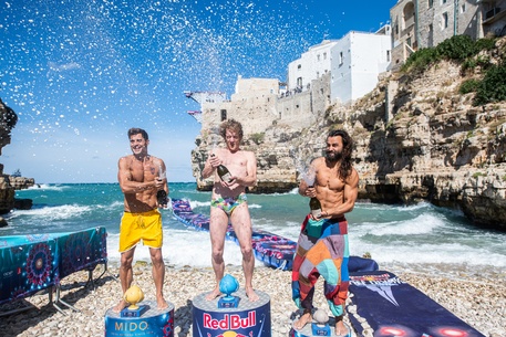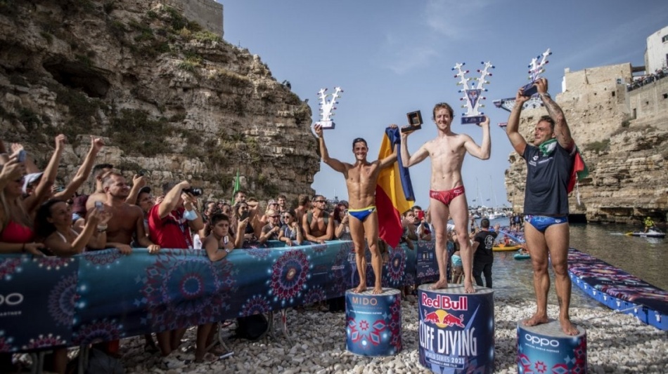 La prima volta di Elisa Cosetti (sotto), la conferma di Alessandro De Rose (in copertina) e l’entusiasmo del pubblico, nella tappa finale del Red Bull Cliff Diving a Polignano a Mare. Elisa Cosetti, all’esordio assoluto in una gara dalle grandi altezze, chiude al decimo posto con 256 punti. Dopo gli obbligatori di sabato era ottava. Alessandro De Rose è terzo nella tappa, premiato con la medaglia di bronzo tra gli applausi dei suoi fan e quarto nella classifica generale, posizione che gli vale il titolo di permanent diver (quindi già qualificato al prossimo circuito delle World Series). Per l’azzurro 130 punti in tappa e 444 nel ranking.