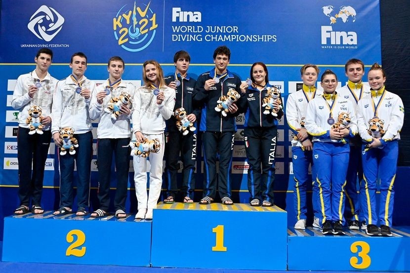 Nella prima giornata dei Mondiali Juniores, al Liko Sport Centre di Kiev, la prima medaglia d'oro di tuffi è dell'Italia. Chiara Pellacani, Riccardo Giovannini e Matteo Santoro (in copertina) si aggiudicano il team event con 309,95 punti battendo i russi, secondi con 0,35 punti in meno, che erano rimasti indietro con i primi tre tuffi e dominando gli altri team. Terza è la Svezia con 293,50. I mondiali giovanili, riservati alle categorie A (17,18 e 19 anni) e B (15 e 16 anni), proseguono fino al 9 dicembre. Cinque salti a disposizione di ciascuna squadra nel team event; uno e mezzo rovesciato da un metro mixed Pellecani-Santoro (55,90), doppio e mezzo avanti con avvitamento da un metro di Santoro (67,20), doppio e mezzo indietro carpiato da tre metri sincro mixed Pellacani-Santoro (54,00), triplo e mezzo avanti carpiato da tre metri di Pellacani (63,55) e triplo indietro raggruppato dalla verticale dai dieci metri di Giovannini (69,30). Nella capitale ucraina si prevede una settimana di spettacolo assicurato, con parte della meglio gioventù di una disciplina in continua evoluzione e soprattutto espansione.