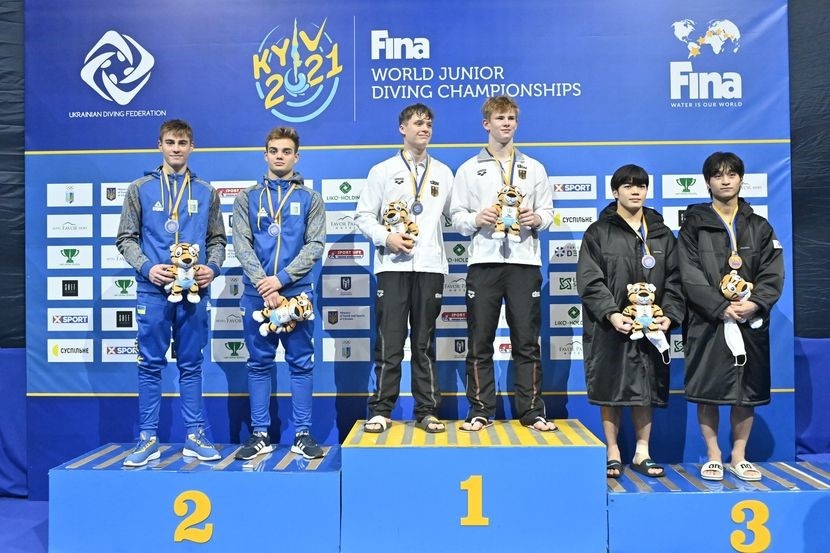 Nella terza giornata dei Mondiali Juniores, in svolgimento a Kiev, un colpo di sfortuna nega sul più bello una medaglia azzurra che sembrava ormai decisamente alla portata della coppia italiana: nella finale sincronizzata dal trampolino di 3 metri Matteo Santoro e Matteo Cafiero, prima dell’ultimo tuffo che li vedeva a meno di un punto dall’oro, incappano in un tuffo nullo e vedono sfumare sul finale le possibilità di podio. Obbligatori non perfetti per gli azzurri che perdono qualche punto sull’ordinario rovesciato, ma con i liberi inizia una rimonta costante e apparentemente inarrestabile: molto buono il doppio e mezzo avanti con avvitamento da 68.40 punti, ancora migliore il triplo e mezzo avanti premiato con 71.61 punti. Nel frattempo i russi incappano in un brutto triplo e mezzo rovesciato, lasciando Germania, Italia e Ucraina a lottare per le medaglie. Tuttavia, proprio all’ultimo tuffo, il doppio e mezzo avanti con due avvitamenti, Cafiero ha qualche difficoltà nel pre salto e prende malissimo la tavola: Santoro lo vede con la coda dell’occhio e riesce a fermarsi sul trampolino in tempo, il suo compagno purtroppo no, e lo zero è inevitabile. Per gli azzurri l’ottavo posto con 222.81 punti e tuttavia la consapevolezza di essere due tuffatori di alto livello: prendendo appena la sufficienza su quell’ultimo tuffo oggi la medaglia d’oro sarebbe stata appesa al loro collo. Oro che va alla Germania di Espen Prenzyna e Jonathan Schauer (in copertina) con 282.81 punti, capaci di difendersi dall’assalto finale ucraino di Bogdan Chyzhovskyi e Danylo Konovalov, già in nazionale assoluta e distanti appena mezzo punto. Bronzo ai coreani Joung Dongmin e Kim Yeongho con 278.31 punti.