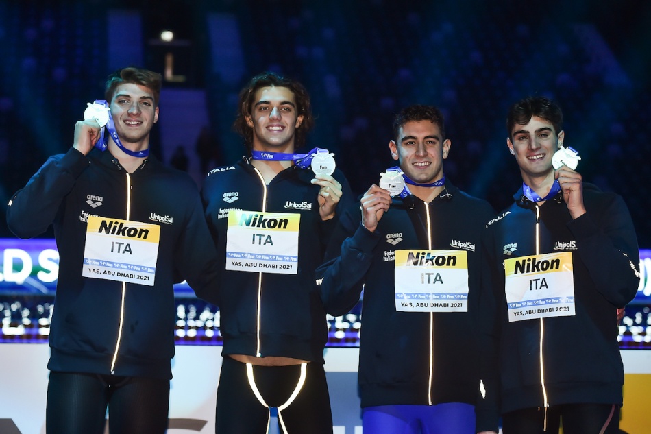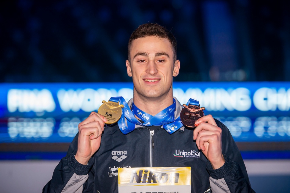 Nella prima giornata dei Campionati Mondiali in vasca corta ad Abu Dhabi, l'Italia è subito protagonista con Alberto Razzetti (in copertina con la medaglia d'oro e di bronzo e sotoo all'arrivo e sotto sul podio dei 200 misti) che si ripete in formato iridato dopo aver battuto il dominatore ungherese Kristof Milak agli europei in vasca corta. Il 22enne di Lavagna emoziona per solidità e sfrontatezza e nei 200 farfalla si piazza alle spalle lo svizzero sorpresa olimpica Noe Ponti (1'49"81) e il sudafricano pluricampione Chad Le Clos (1'49"84).