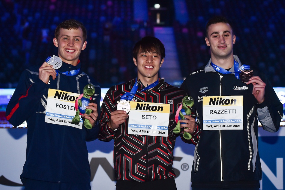 Razzetti diventa il quinto atleta campione iridato individuale della storia italiana ai mondiali in vasca corta dopo Fabio Scozzoli nei 100 rana (2012), Ilaria Bianchi nei 100 farfalla (2012), Gregorio Paltrinieri nei 1500 (2014) e Federica Pellegrini nei 200 sl (2016). Chiusura in grande stile per la 4x100 stile libero maschile che cede alla Russia solo negli ultimi metri: è d'argento col record italiano di 3'03"61 per sedici centesimi con le frazioni di Alessandro Miressi (46"12), Thomas Ceccon (45"71), Leonardo Deplano (45"98) e Lorenzo Zazzeri (45"80) superato allo sprint da Aleksandr Shchegolev, autore della frazione lanciata più veloce di tutti in 45"53. La prestazione della squadra italiana è eccezionale e demolisce il precedente record italiano di 3'05"20 stabilito da Santo Yukio Condorelli, Miressi, Marco Orsi e Zazzeri l'11 dicembre 2018 ad Hangzhou. Dietro agli azzurri ci sono gli americani con Zach Apple in chiusura come per l'oro olimpico di Tokyo.