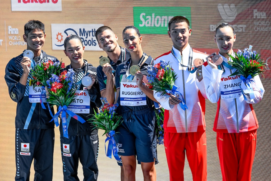 Nell’ultima giornata del sincro ai Campionati Mondiali di Nuoto, a Budapest, Giorgio Minisini e Lucrezia Ruggiero (in copertina e sotto) fanno Bingo! Due medaglie d’oro nella stessa edizione dei campionati del mondo è un’impresa per pochi. Un evento quasi mitologico da tramandare a figli e nipoti. Il nuoto sincronizzato italiano in questi ultimi anni ci ha abituato a grandi imprese, ma questa le supera tutte.